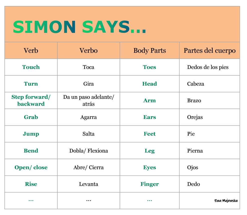 G. Después de la frase los niños tiene que hacer lo que diga Simon, pero si Simon no empieza la frase con "Simon says" no tienen que hacer nada. Si unos de los niños se equivoca o lo hace en manera incorrecta estará eliminado.